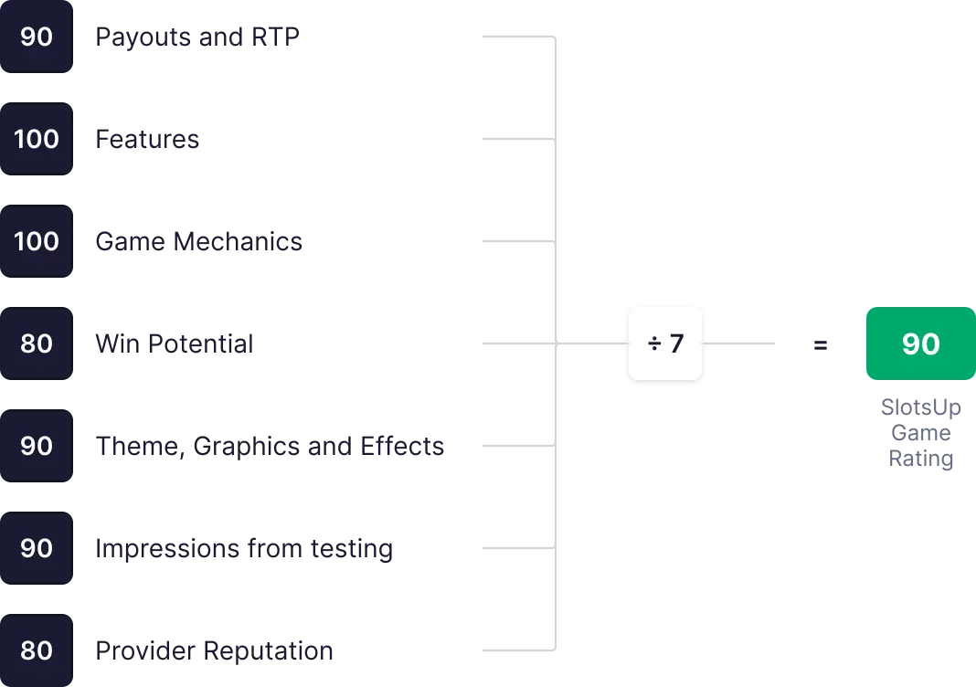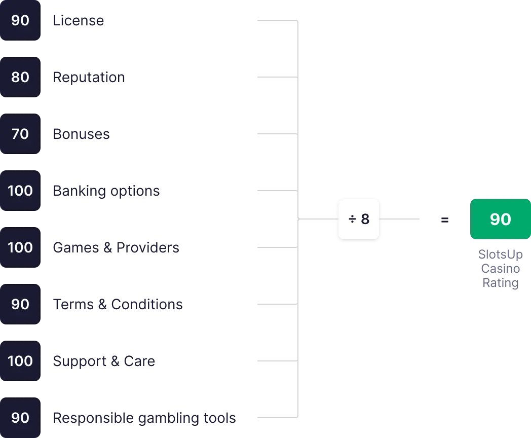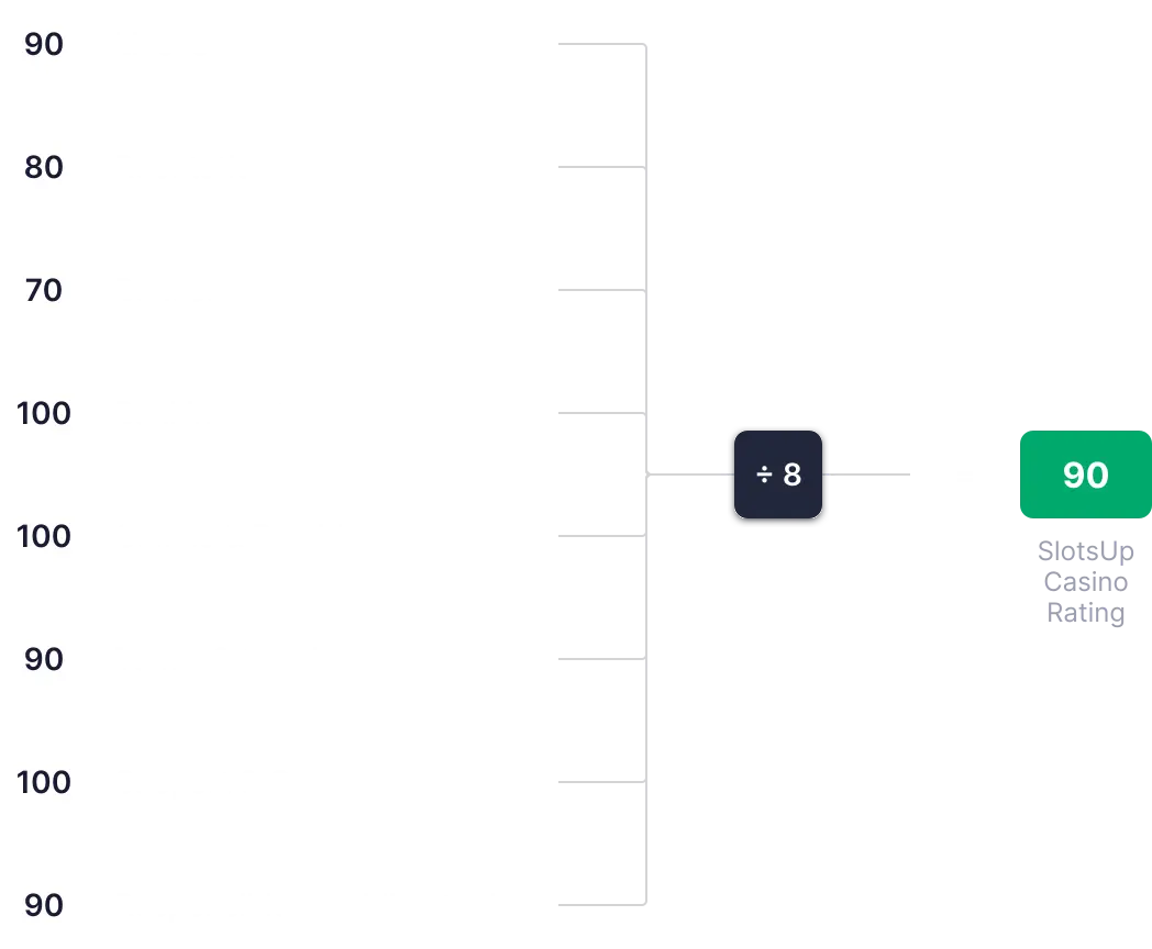 SlotsUp Ocjena Casina izračunava se na temelju 8 ključnih metrika, svaka se ocjenjuje od 0 do 100. Ove ocjene se zbrajaju, prosječe i koriste za konačnu ukupnu ocjenu.