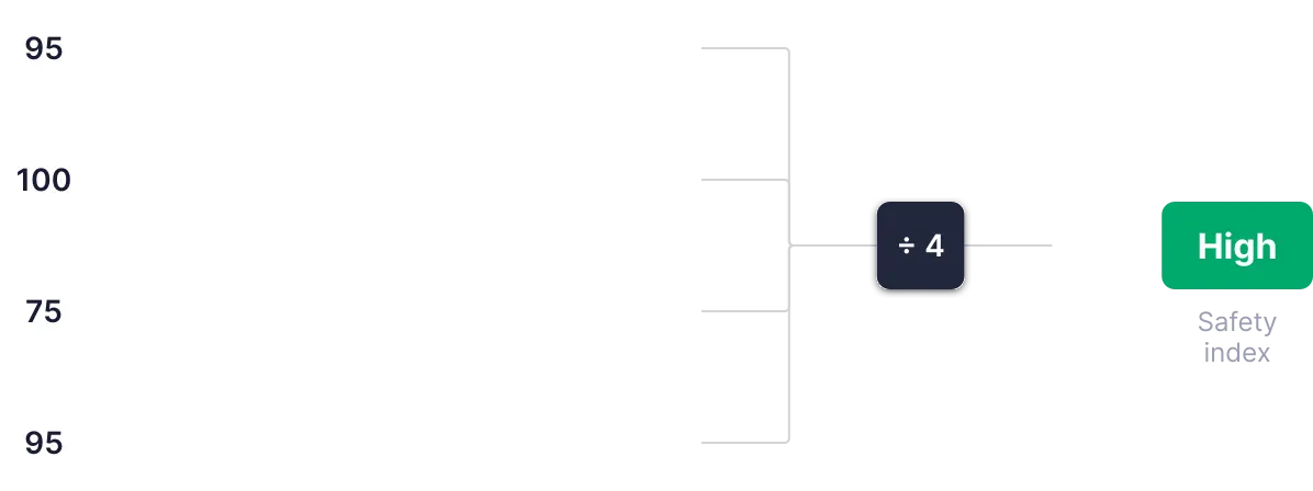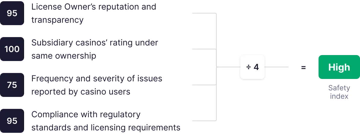 Procjenjujemo sigurnost kasina na temelju 4 kriterija (2 pojedinačna i 2 međusobno povezana), svaki ocijenjen od 0 do 100. Ocjene se zatim zbrajaju, prosječe i koriste za određivanje konačnog indeksa sigurnosti.